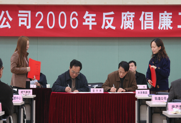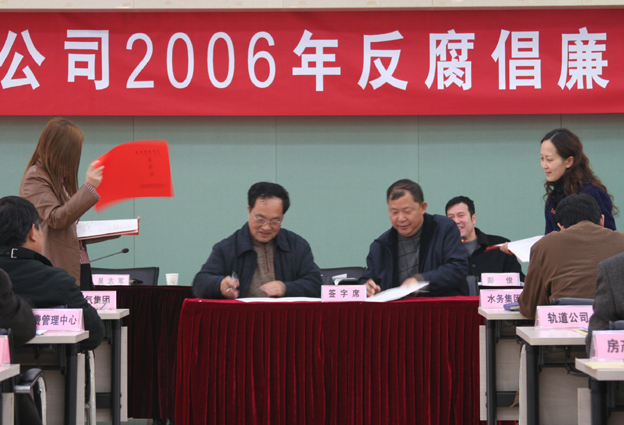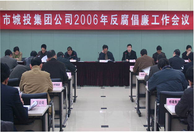 2月14日,公司在4樓大會議室召開了2006年反腐倡廉工作會議。此次會議是為了認(rèn)真學(xué)習(xí)貫徹中央和省市反腐倡廉工作會議精神、總結(jié)城投集團(tuán)公司2005年黨風(fēng)廉政建設(shè)、反腐敗工作和研究部署2006年反腐倡廉工作召開的。會議進(jìn)行了三項(xiàng)議程:一是黨委副書記、紀(jì)委書記吳志軍同志作題為《全面履行職責(zé),加大防治力度,深入推進(jìn)黨風(fēng)廉政建設(shè)和反腐敗工作》的工作報(bào)告;二是黨委書記、董事長吳長均同志與所屬各單位黨風(fēng)廉政建設(shè)第一責(zé)任人簽訂黨風(fēng)廉政建設(shè)責(zé)任書;三是吳長均同志就如何深入推進(jìn)城投集團(tuán)公司黨風(fēng)廉政建設(shè)作重要講話。