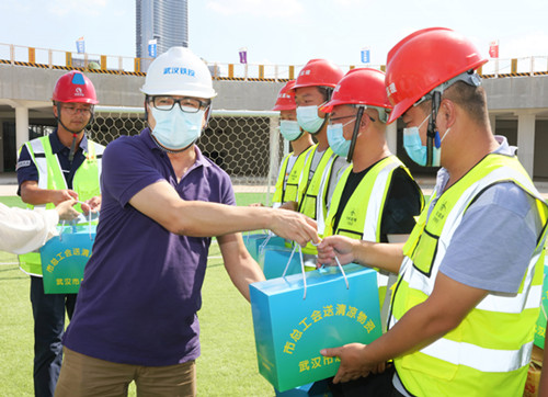 8月26日下午,武漢市總工會(huì)副主席李兵帶隊(duì),在集團(tuán)公司工會(huì)主席江強(qiáng)生的陪同下,來(lái)到集團(tuán)公司所屬鐵投公司月亮灣城市陽(yáng)臺(tái)項(xiàng)目工地,慰問(wèn)項(xiàng)目建設(shè)一線職工,為勞動(dòng)競(jìng)賽加油鼓勁。市總工會(huì)經(jīng)濟(jì)部部長(zhǎng)吳志武等參加活動(dòng)。