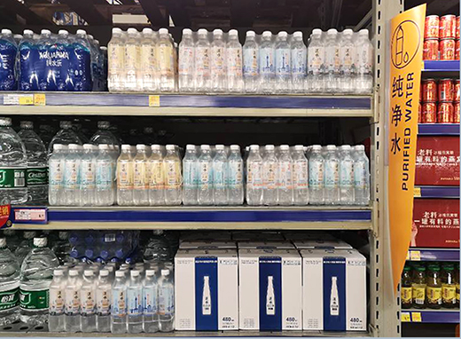 目前”?h水1906“以整箱形式銷售,上架銷售有兩款規(guī)格飲用純凈水,其中“長江之心”高端款式每瓶480毫升每箱12瓶,售價48元/箱,單價4元/瓶;“武漢映象”普通款式每瓶500毫升每箱12瓶,售價30元/箱,單價2.5元/瓶。